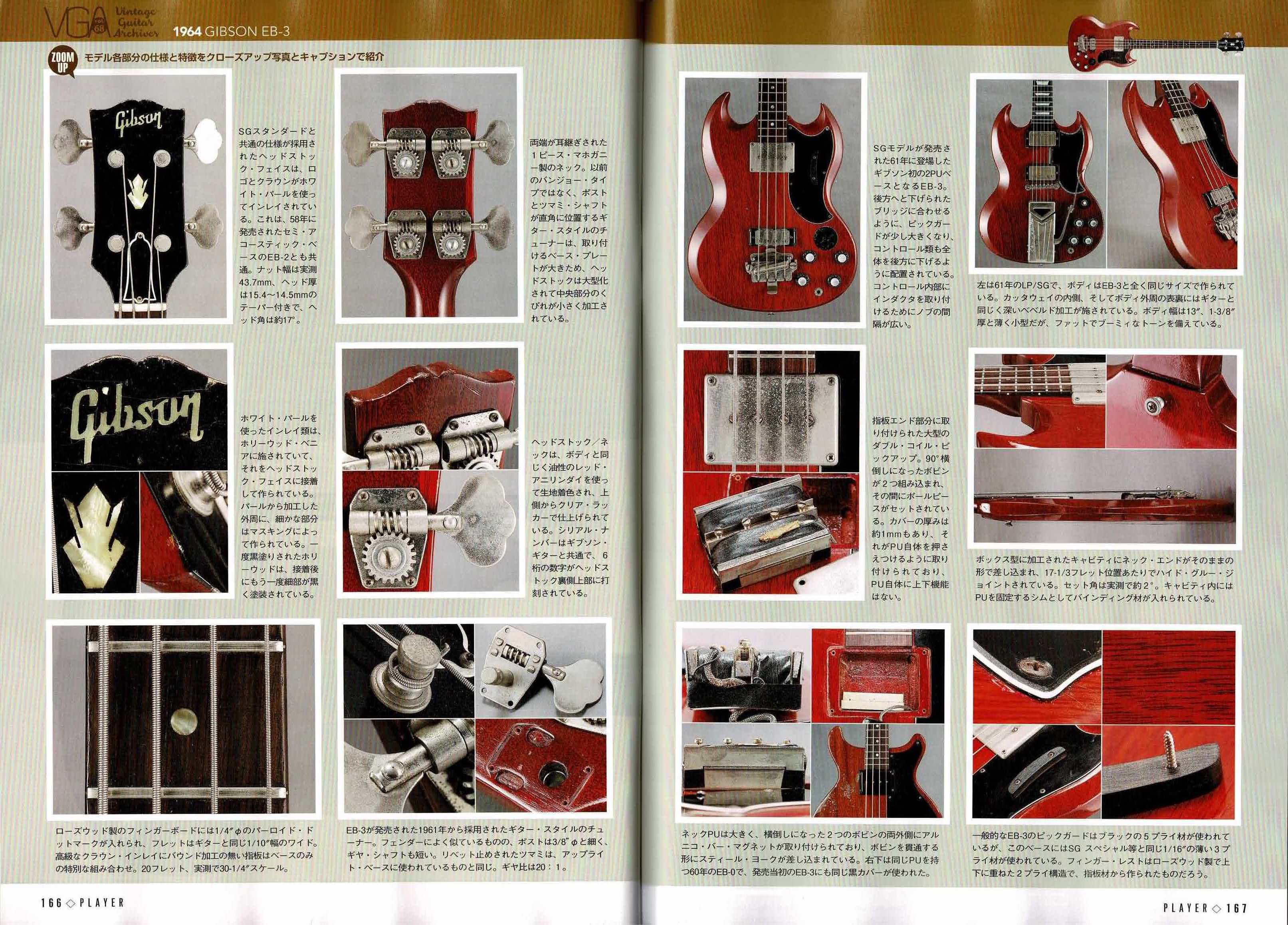 ギブソン・ベースの中で最も成功したモデルが1961年に発表されたEB-3である。この年、新しいレスポール・モデルとしては発表されたSGシェイプをそのまま使ったEB-3は、軽量な小型ボディ、深いダブルカッタウェイ、30-1/4インチのショート・スケール、歴代ピックアップの中でも最もパワフルなベース・ハムバッカーを搭載していた。フェンダーが圧倒的なシェアを占めていたエレクトリック・ベースの中で、対照的なギブソンらしいキャラクターと、ベースのドライヴ・サウンドという新しいトーンを生み出した魅力的なベースである。1964年製のEB-3を徹底解析してみた。