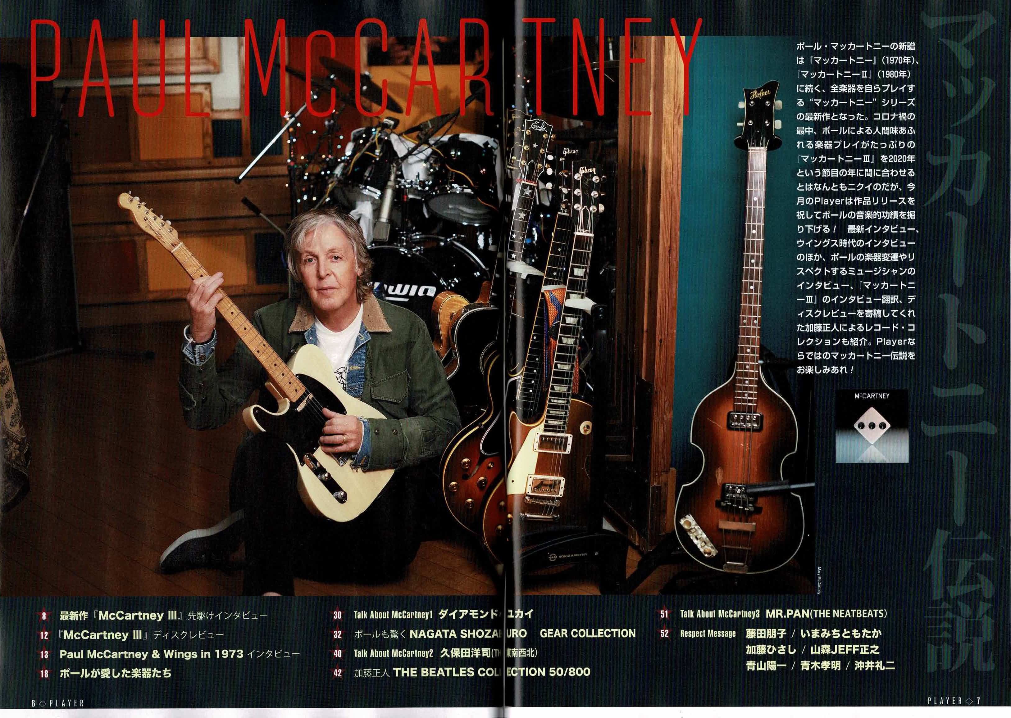 ポール・マッカートニーの新譜は『マッカートニー』(1970年)、『マッカートニーII』(1980年)に続く、全楽器を自らプレイする“マッカートニー”シリーズの最新作となった。コロナ禍の最中、ポールによる人間味あふれる楽器プレイがたっぷりの『マッカートニーⅢ』を2020年という節目の年に間に合わせるとはなんともニクイのだが、今月のPlayerは作品リリースを祝してポールの音楽的功績を掘り下げる! まずは『マッカートニーⅢ』の最新インタビュー、さらに1973年のウイングス時代のインタビューを再掲載。“ポールが愛した楽器たち”と題して、ビートルズからソロ時代までの楽器変遷をレポートするとともに、SSMPの永田ショーザブローにポール所有器と同時期製の楽器コレクションも披露いただいた。ダイアモンド✡ユカイ、久保田洋司(THE 東南西北)、MR.PAN(THE NEATBEATS)らリスペクトするミュージシャンのインタビュー、リスペクトコメントも掲載。そして、『マッカートニーⅢ』の最新インタビュー翻訳、ディスクレビューを寄稿してくれた加藤正人氏による貴重なレコード・コレクションも紹介している。Playerならではのマッカートニー伝説をお楽しみあれ!