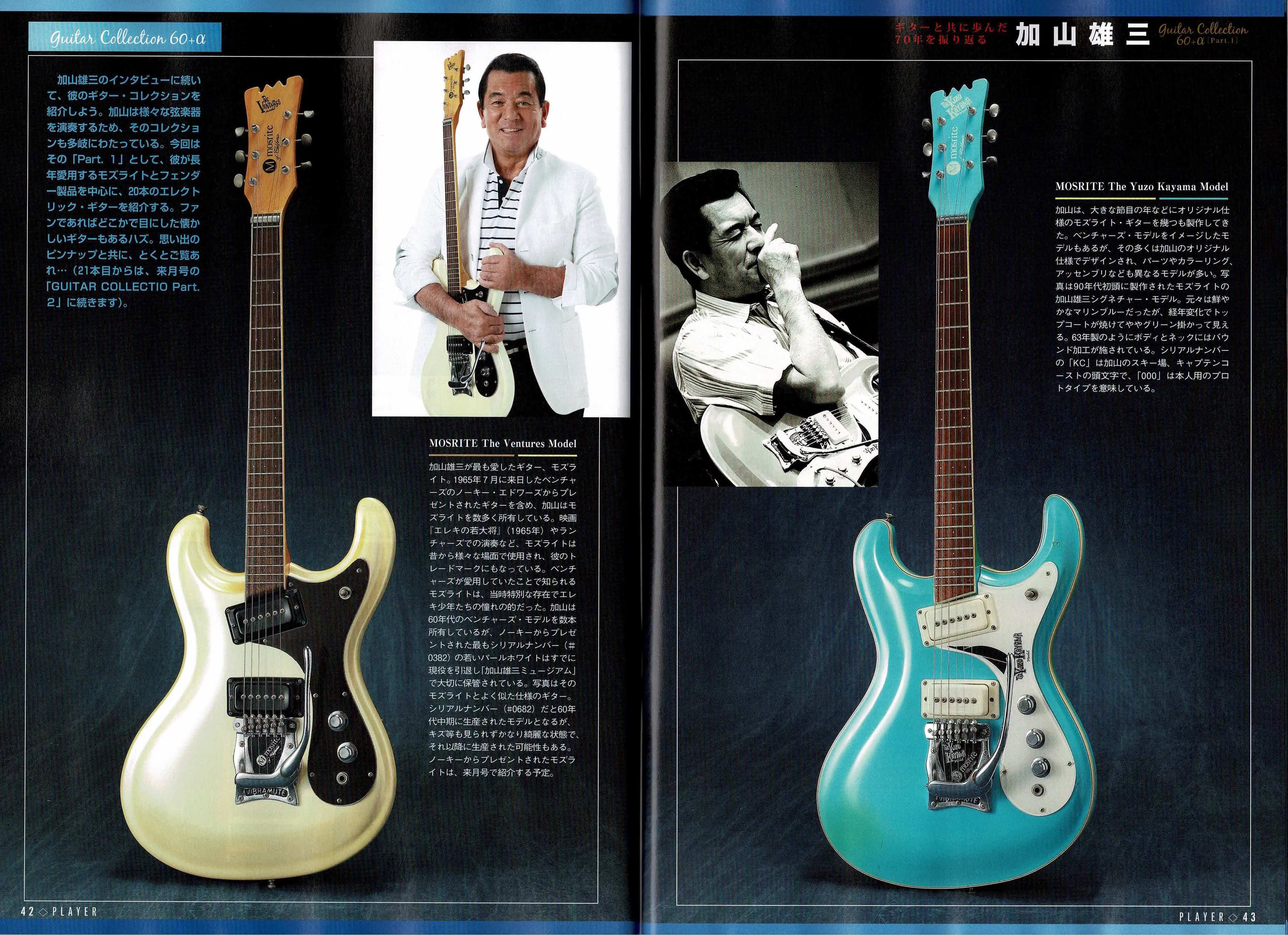 1960年代は、世界中でエレキギターによるインストの大ブームが巻き起こった。日本もその例外ではなく、ベンチャーズがヒットチャートを賑わし、加山雄三の主演映画「エレキの若大将」が大ヒット。加山がエレキギターを弾き、歌うシーンに若者たちは誰しもが憧れ、加山は一気にスターダムにのし上がった…。そんな加山雄三も現在83歳。今年は新型コロナ騒動でコンサートはキャンセルされたが、彼の音楽に対する創造力は衰えることを知らない。この特集は、そんな加山が70年に亘る音楽人生を振り返りながら、ギターの思い出とともに膨大なギターコレクションを美しい写真で紹介する特別企画。今回の第一弾は、加山と馴染みが深いモズライト・ギター、フェンダー・ギターを中心に、20本のギターコレクションを紹介する。この特集は、次号へと続く…。